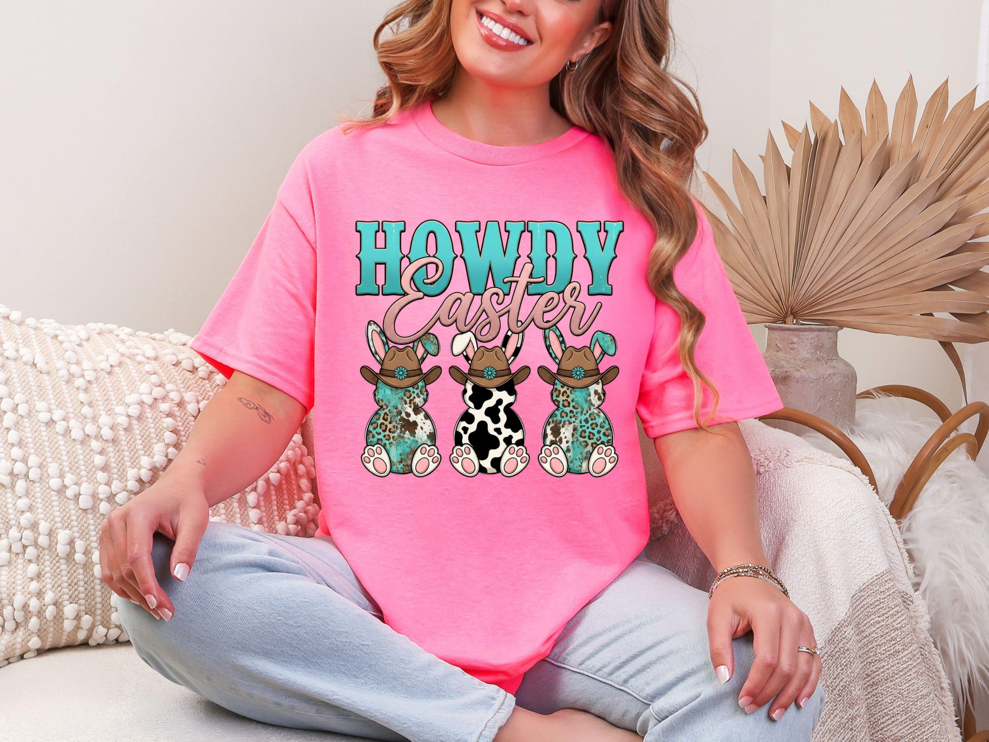 This fun and festive tee features three adorable bunny babes rocking cowboy hats with turquoise + cow print details โ the perfect mix of western charm and spring vibes!