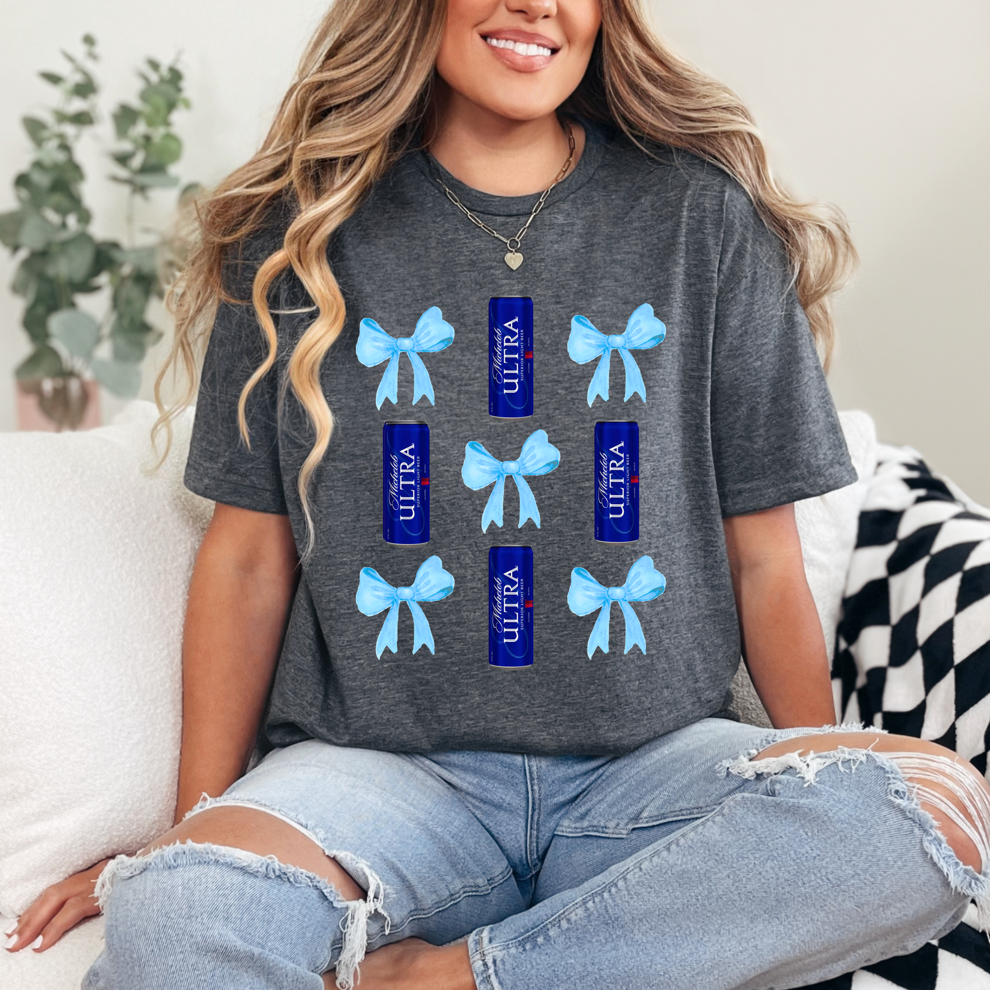 Featuring a playful bow pattern paired with drink-inspired artwork, this tee is perfect for laid-back days, casual outings, or styled up with your favorite denim.