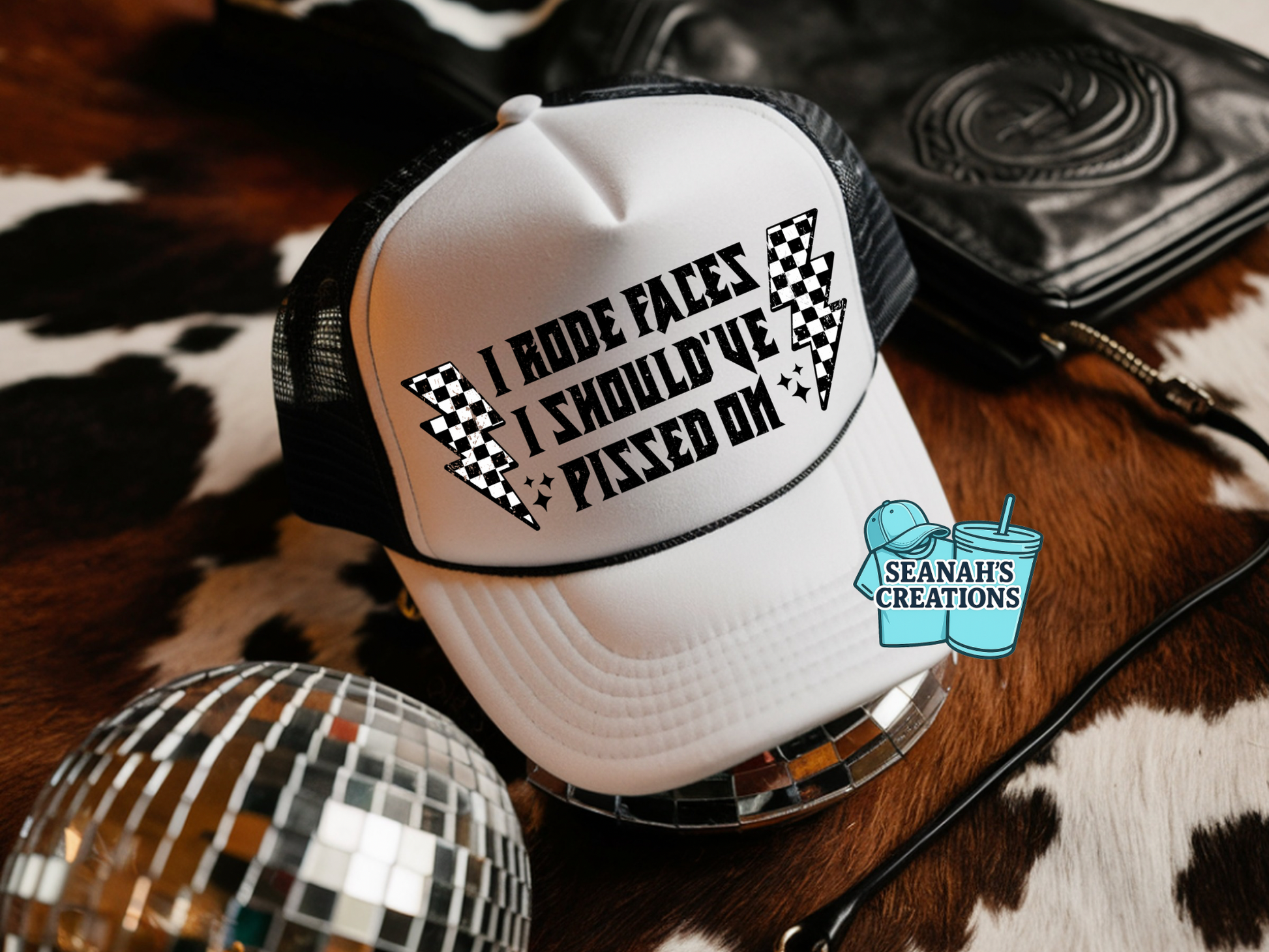 Turn heads with this bold and unapologetic trucker hat. This black and white foam-front hat features the phrase “I Rode Faces I Should’ve Ridden On” with checker lightning bolt accents for the perfect edgy statement look.